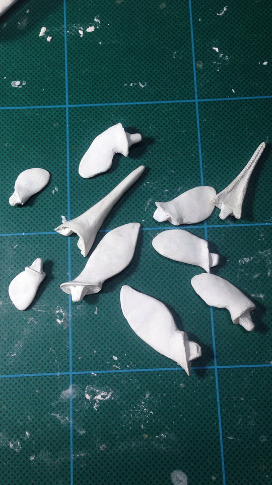 开始做下巴了。本来不打算做牙齿,但觉得没牙齿觉得很奇怪,咋咬箭石头?即使做不到很细尖,但起码也要有点样子吧。牙齿待干后刻的,感觉这材料刻起来不滞刀,挺好的。