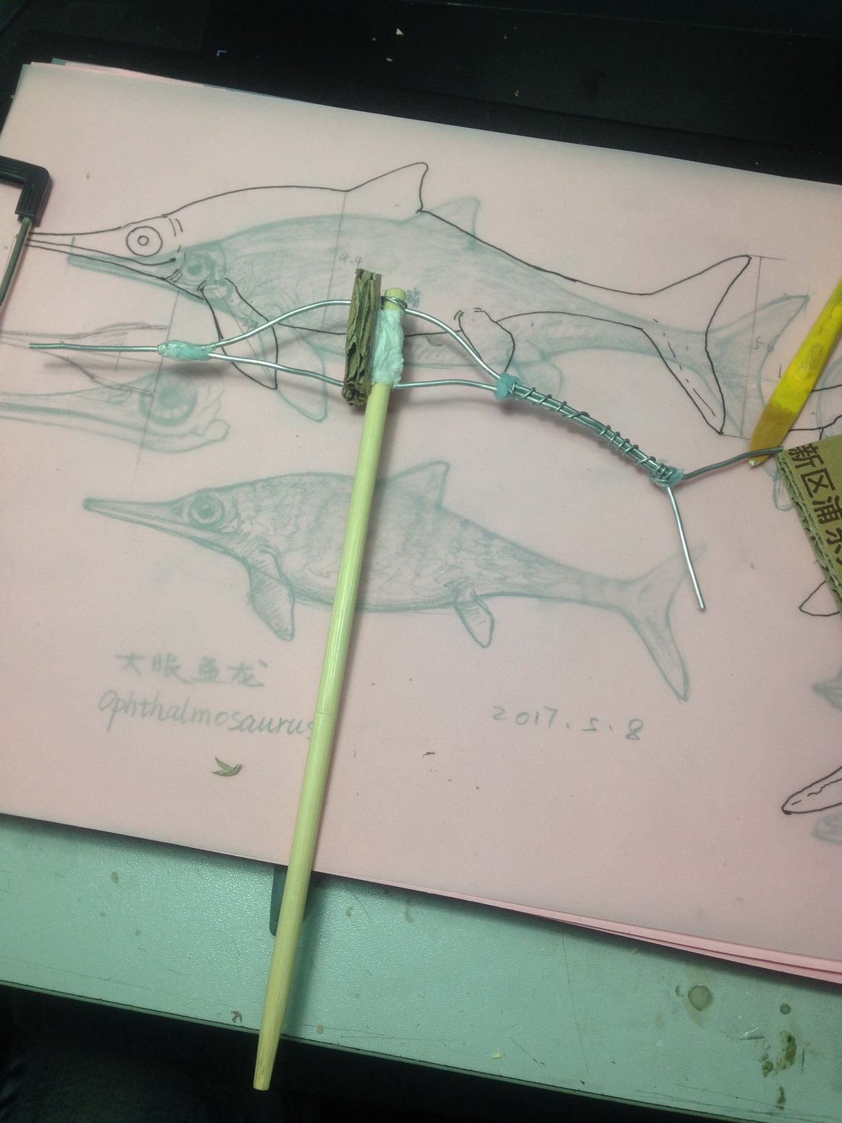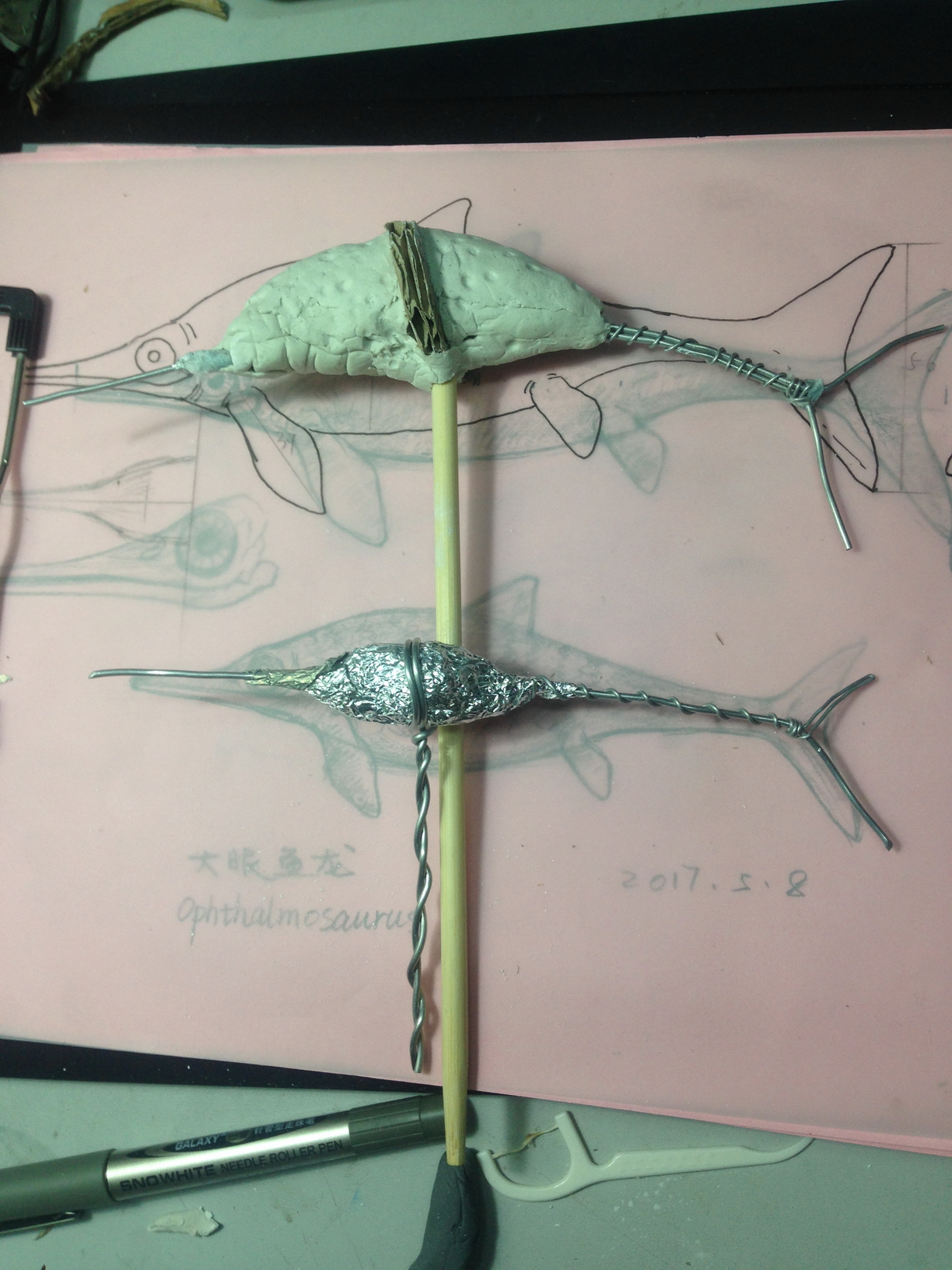 这时小鱼龙的骨架也跟进制作了,中间裹铝箔纸。