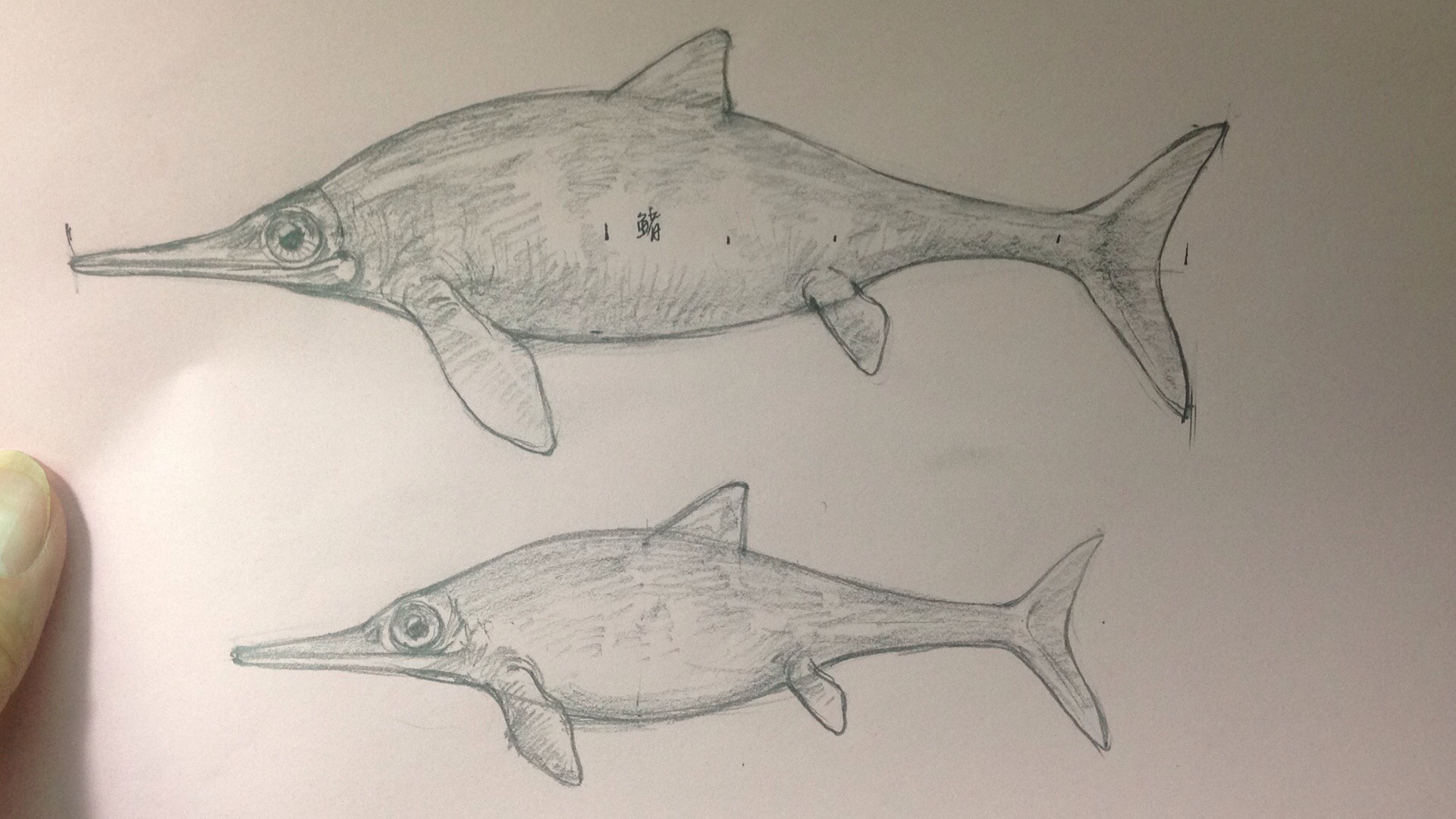 聊的过程,我脑海里呈现一个画面,然后快速的速涂下来了。表现的是鱼龙母子咬着箭石在海里嬉戏。(箭石生活在泥盆纪至白垩纪之间,因有一个箭头状的鞘而得名。箭石与现代的乌贼类比较相似,但壳体远比乌贼的壳体发达。)