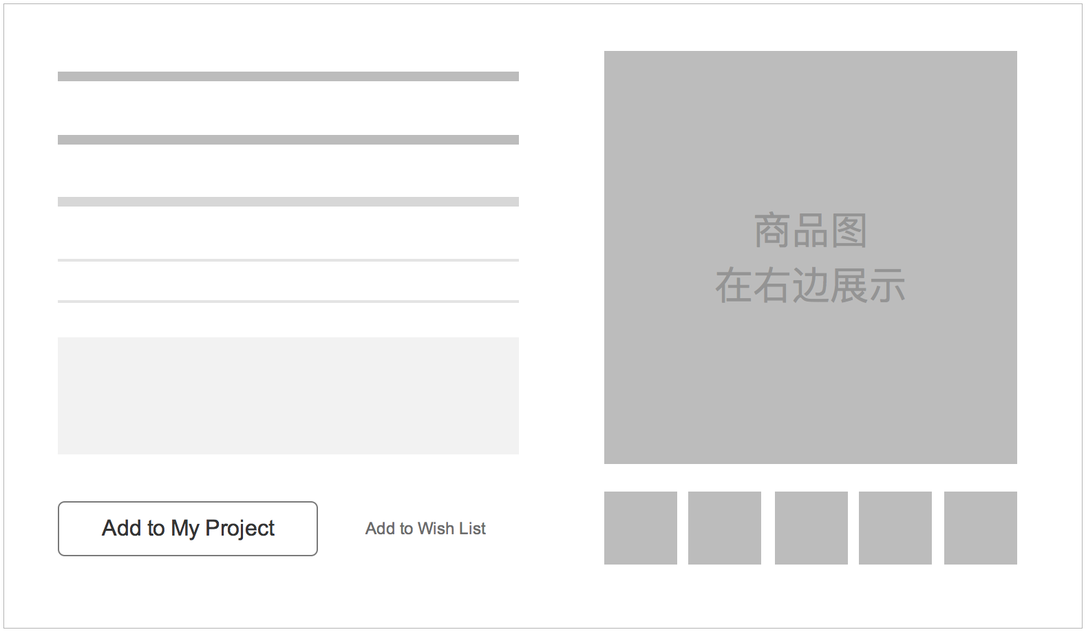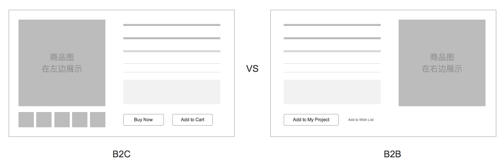 B2C:“产品”,重要的是产品图以及产品信息,希望能立马促使用户购买,用户熟悉的操作习惯是在右边,顾大部分的商品图在左边(大部分人是右撇子)