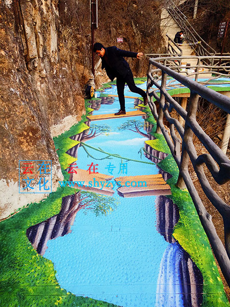 我们上海云在文化3D立体画公司,收到甲方的诉求之后,成立项目组,首先安排项目经理奔赴现场,考察具体情况,设计师具体测量位置,找3D立体画玻璃栈道透彻点。我们项目负责人,给3D玻璃栈道景区提出前期要求,如果要做的话,路面必须保证干净,必须用高压水枪冲洗,之后我们前期会安排工作人员进行基层处理。