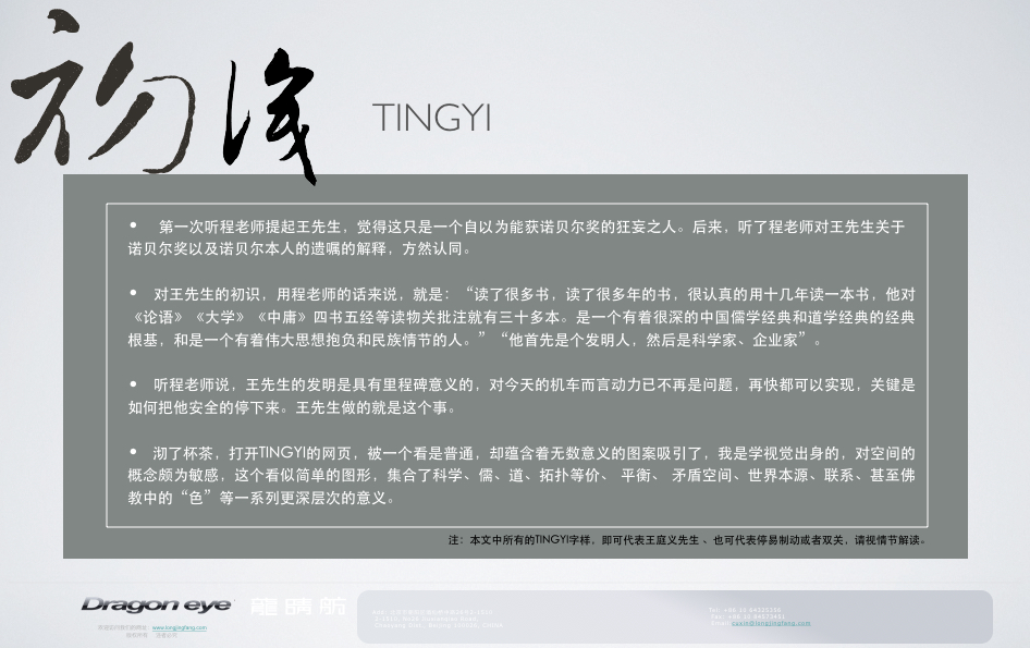 2010年11月,程叔叔找到我们,让我们为王庭义先生的停易制动做一个策划。但是,他告诉我们这个策划不好写,因为王庭义先生极具文化内涵,曾沿老子化胡的道路一路朝圣,对科学、儒、道、拓扑等都有很深入的研究。庭义先生的停易制动更是被认为是很多大型机、车制动必不可少的设备。说真的,程叔叔刚介绍庭义先生不久的时候,我觉得庭义先生极其狂妄,还有点走火入魔,我是想拒绝写这篇策划的,主要也很难找到相同的语境,我并不认可他说的。但出于对长辈的尊重,我又不得不应承下来。