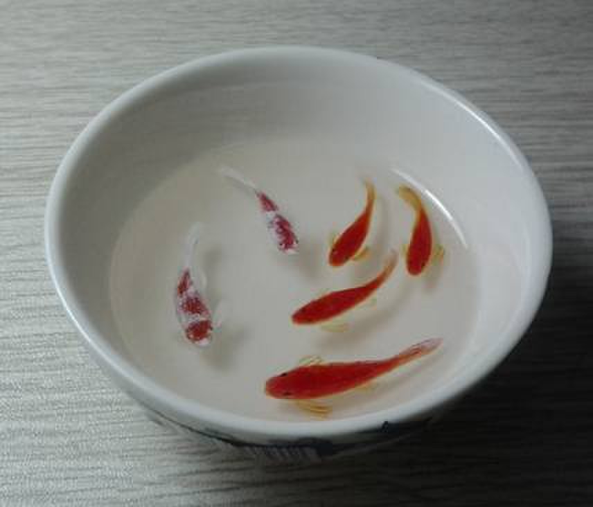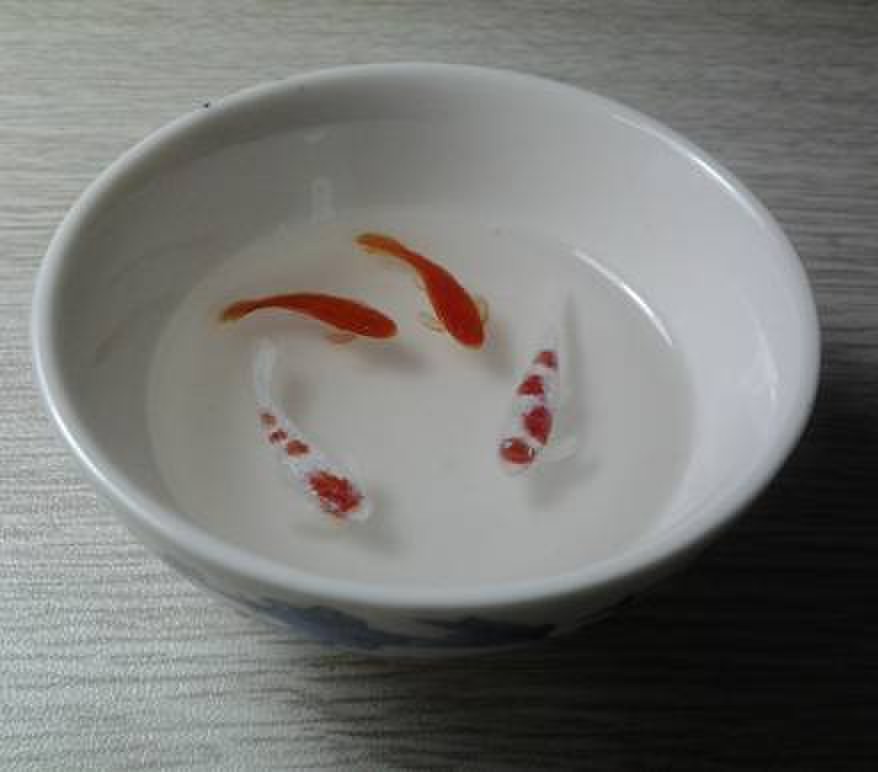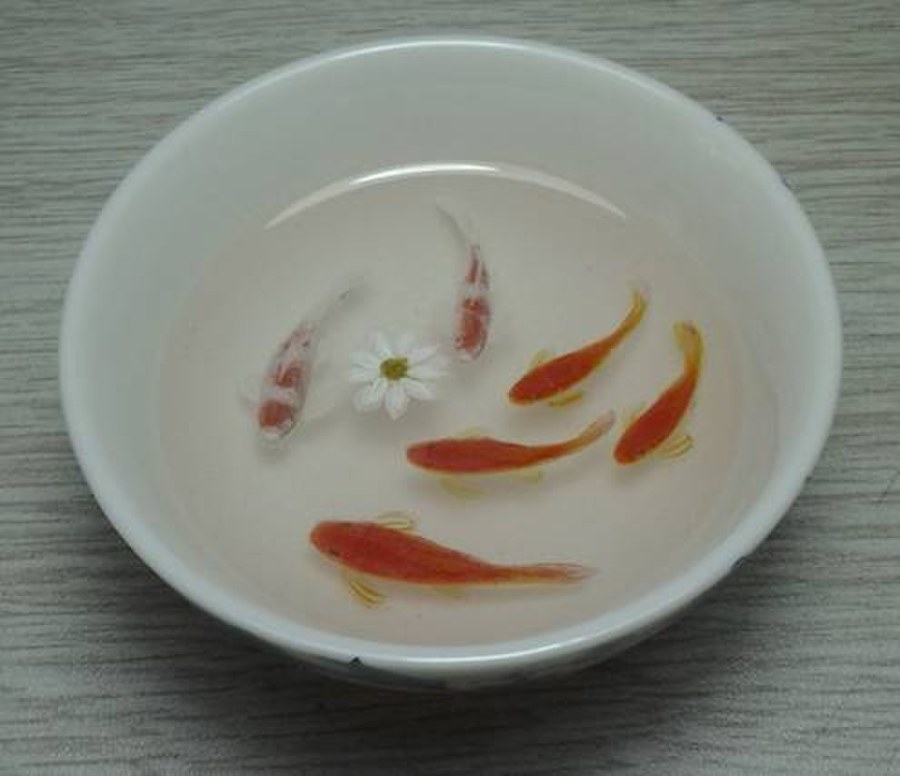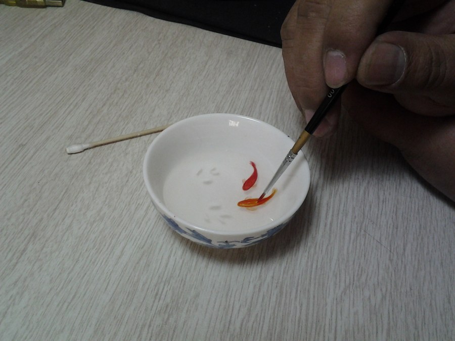 5、第三层,画第二层鱼身时,要将鱼眼先点上,然后从鱼身体纵线中向两边画,需要注意的是不要完全将第一层鱼身覆盖,越画到第一层鱼身边缘颜料越薄一些,可以勾出部分高光和鱼鳞,因本次画的是小金鱼,尾部可在第一层鱼身时一起画出,第二层鱼身时再描一些。倒树脂封口。