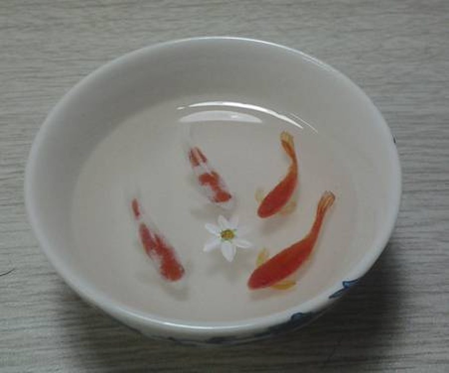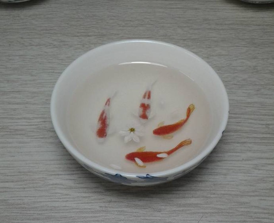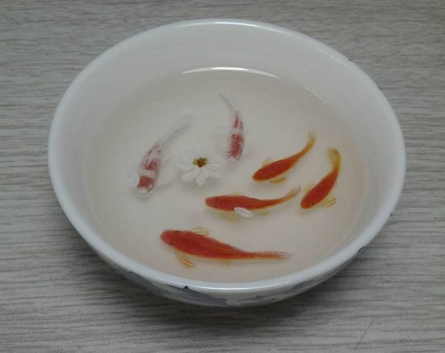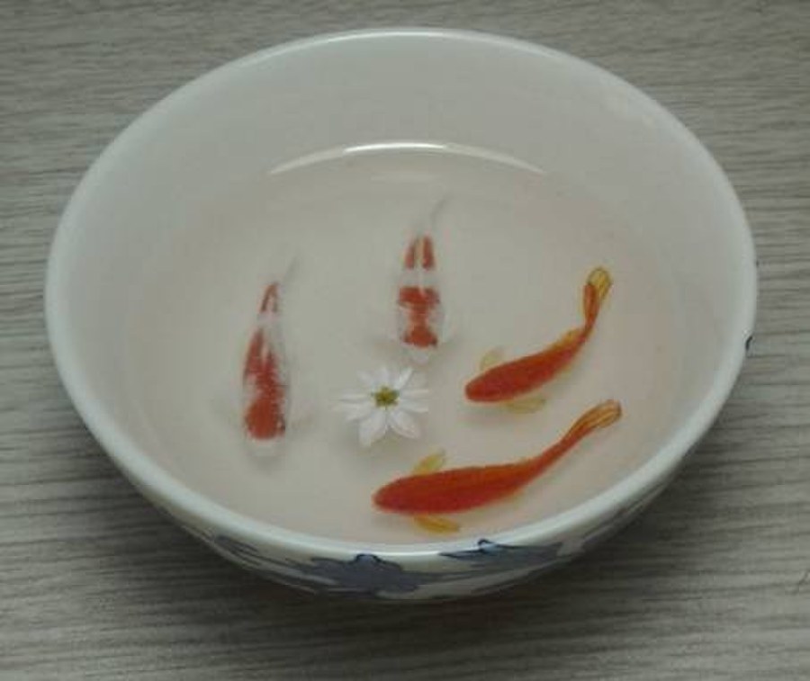画者留意网络间传播的深堀隆介作品,苦心专研,另辟创作自己的树脂金鱼画,虽难与大师级人物作品相比较,但自信有已特色,如遇名师,见笑见笑。