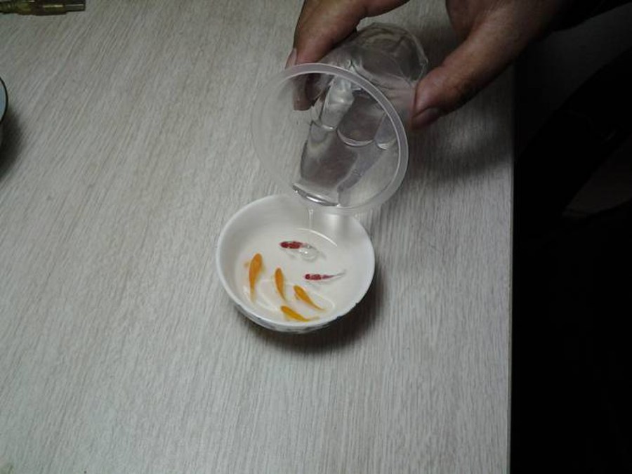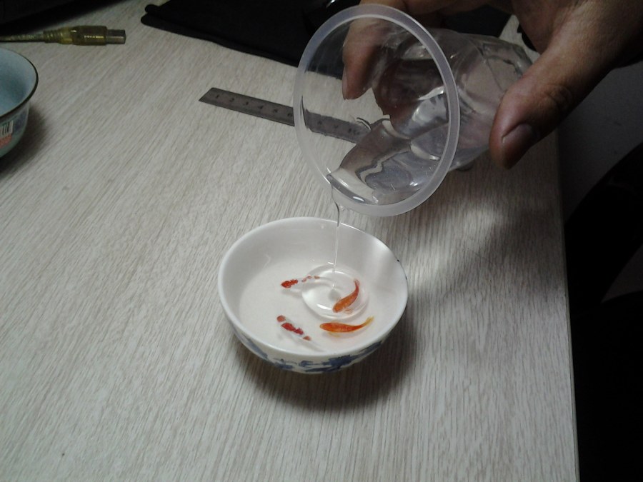 2、开始着手,树脂金鱼画的第一步不是画,二是利用好容器,进行构图,或者在纸上草拟一下图稿,当然经过千锤百炼的老手,也可直接上手,第一道工序是调配树脂,话说每种树脂的调配不尽相同,具体就要自行与卖树脂的学习喽,画者介绍的是环氧类树脂,按照比例调配好,倒入准备画画的容器中,不可太少,太少鱼身不回在容器底部形成较大投影,从而影响立体感。将容器封口,可用厨房中常用的保鲜膜加皮筋。以免灰尘和湿气影响树脂透明度。如果室温较低,可以将树脂配加温搅拌,然后再倒入容器中,减少固化时间,此步骤在后面几次倒树脂的程序中皆可使用。