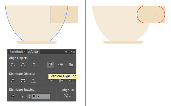 让我们在杯子上加一个把手。做一个130×80 px形状使用矩形工具(M)。选择两个杯子和矩形并单击杯再次使它成为一个关键对象(您将看到一个厚的选择)。头向对齐面板,点击垂直对齐,将两个图形对齐到顶部。