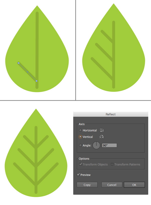 在叶子上添加一些静脉。选择纹理,双击反射工具(O),选择垂直轴。点击复制,将形状水平翻转,并将纹理连接到midrib的另一侧。