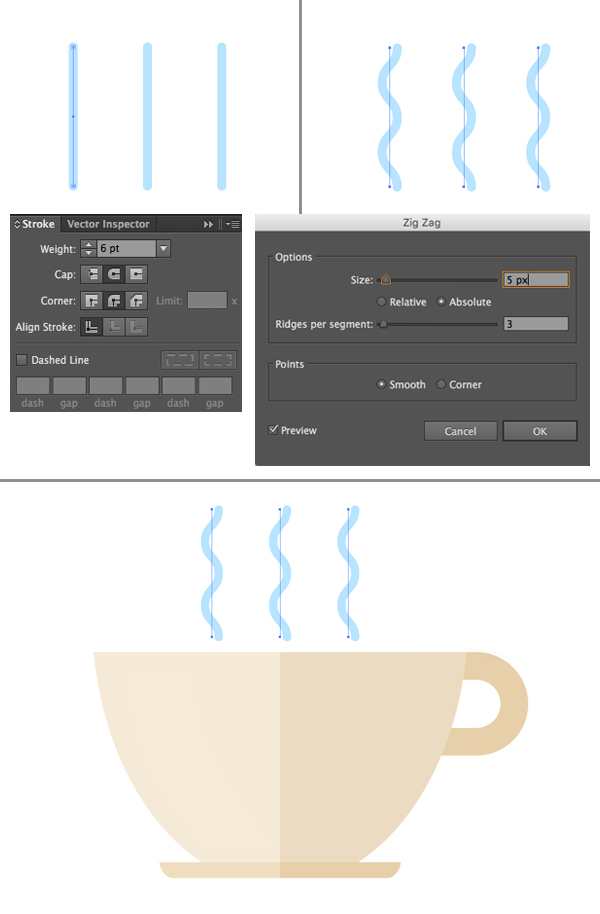 现在让我们从热杯中升起一种程式化的蒸汽。使用线段工具(\)和按住Shift键,形成三条垂直线。头部到中风面板,将重量设置为6 pt,Cap和拐角到中间位置,这样就可以使线条的尖端变得圆润。