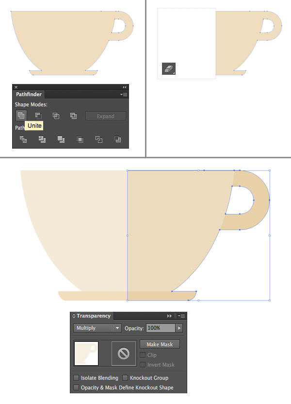 使用橡皮擦工具(shift - e),按住Alt键删除合并后形状的左半部分。将剩下形状的混合模式在透明面板中增加,调整颜色,将杯子的右边变暗。