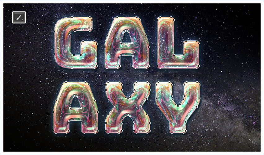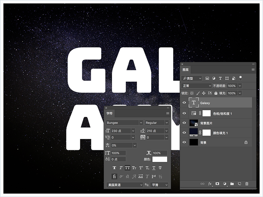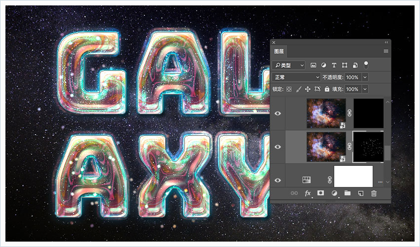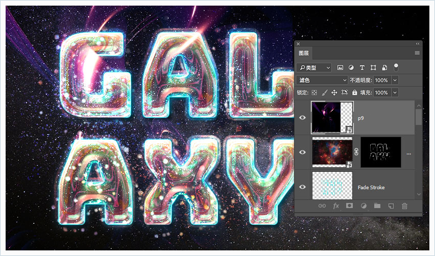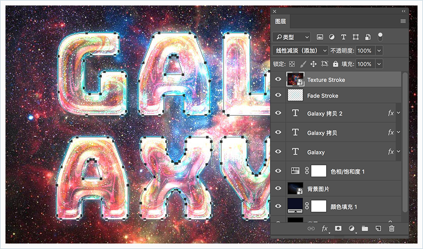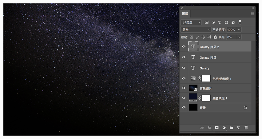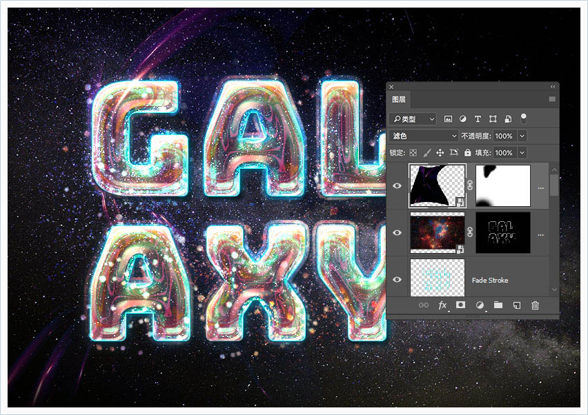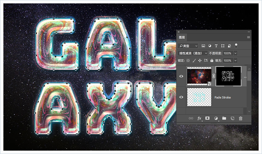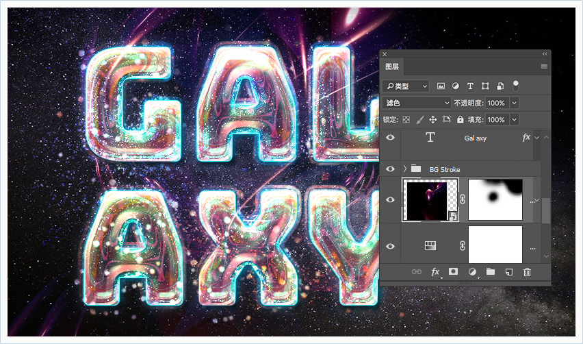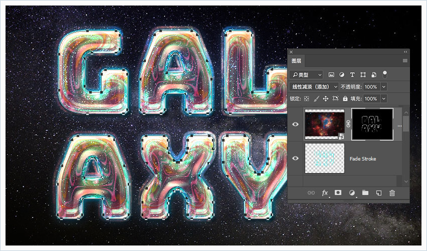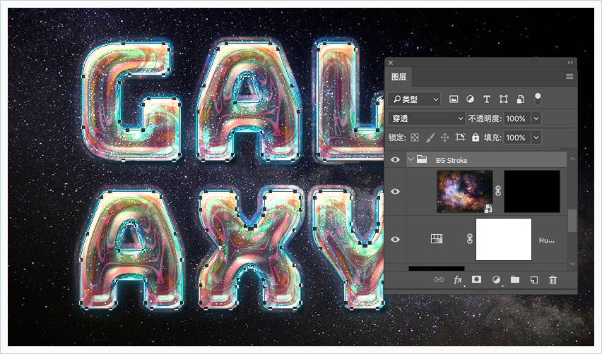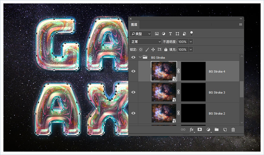 将Galaxy图像放置在原始文本图层下方,根据需要调整其大小,并将其图层重命名为BG Stroke1。