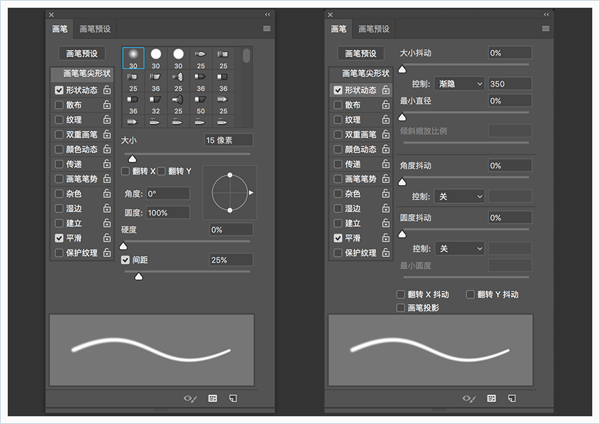 选择画笔工具并打开画笔面板(窗口>画笔)。
