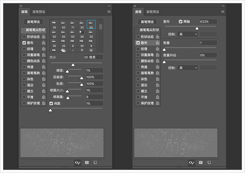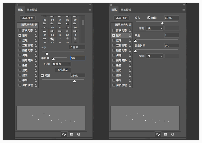 通过取消选中“ 形状动态”选项卡,并使用“ 画笔笔尖形状”和“散布”的设置,更改相同笔刷笔尖的设置以获得不同的结果: