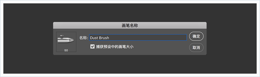 单击画笔面板右下角创建新画笔图标,设置名称为Dust Brush,然后点击OK。