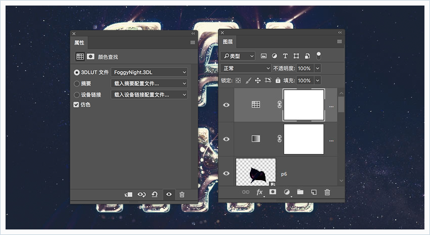 在所有图层之上添加颜色查找调整图层,并使用3DLUT文件中的FoggyNight.3DL。