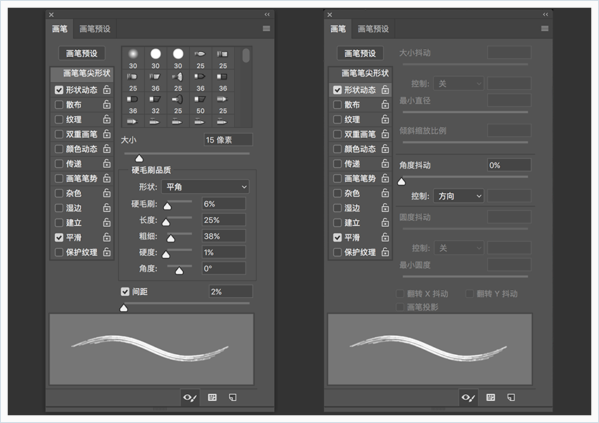 选中画笔工具,选择平角 32px 画笔尖端,然后设置“ 画笔笔尖形状”和“ 形状动态”: