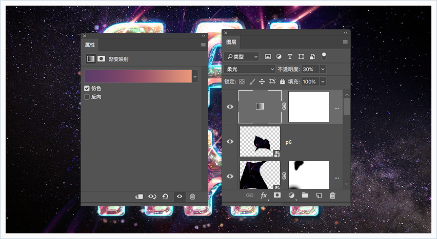 将渐变图层的混合模式更改为柔光,其不透明度更改为30%。