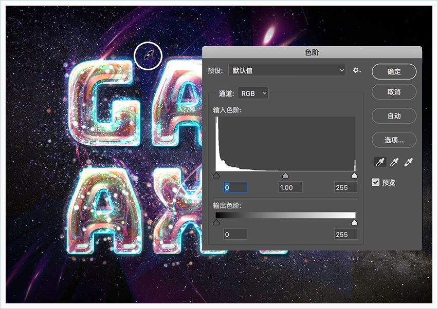 如果光线的背景很明显,你可以选择图像>调整>色阶,单击在图像中取样以设置黑场图标,然后单击要变暗的背景区域。