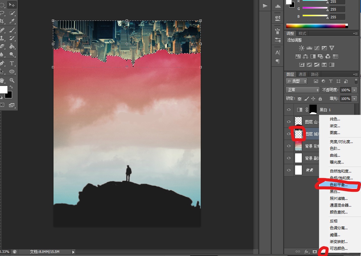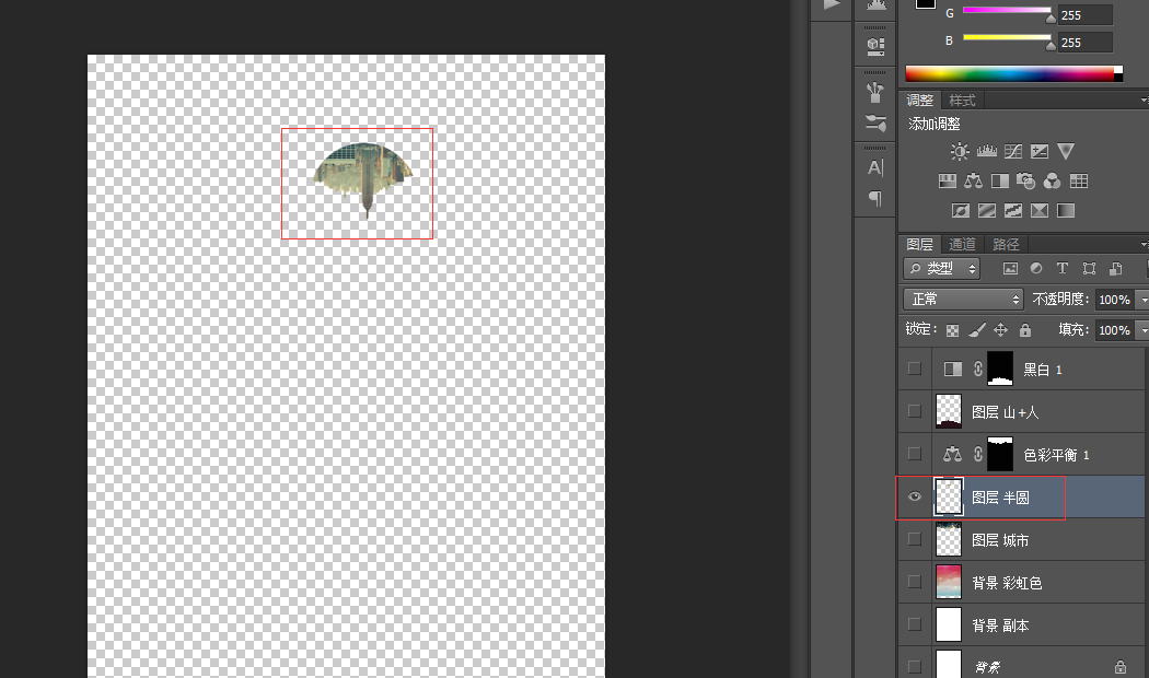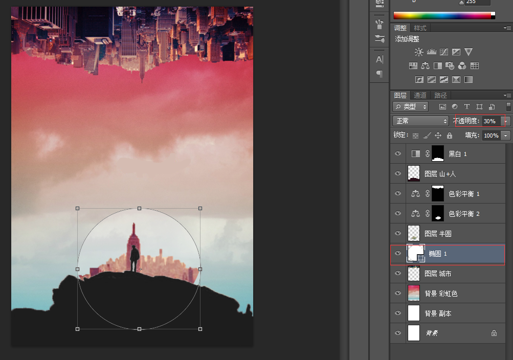 第六步:拉出一个白色的圆调整到和复制出城市一部分一样大小,然后调低白色圆的透明度放在后面,合并图层,最后叠在人后面调整大小和高低。