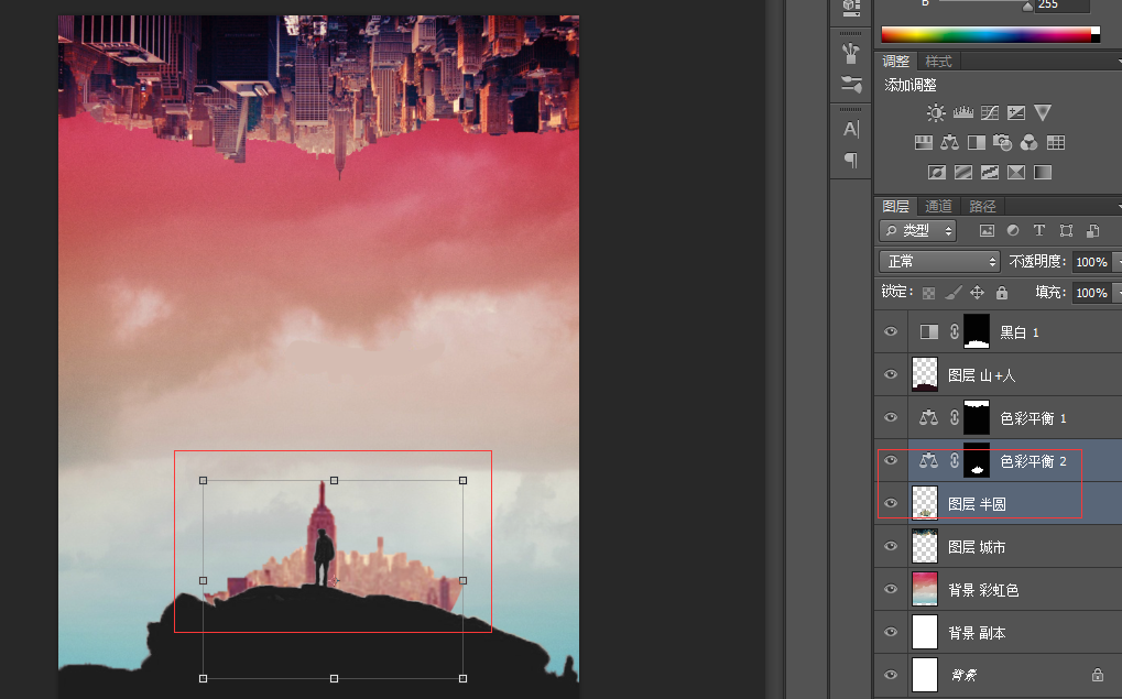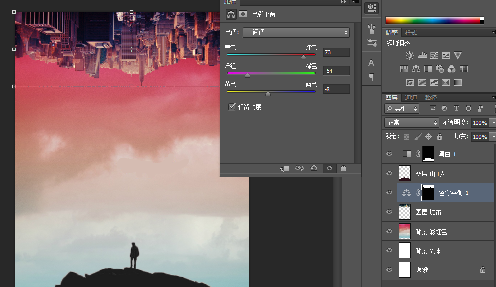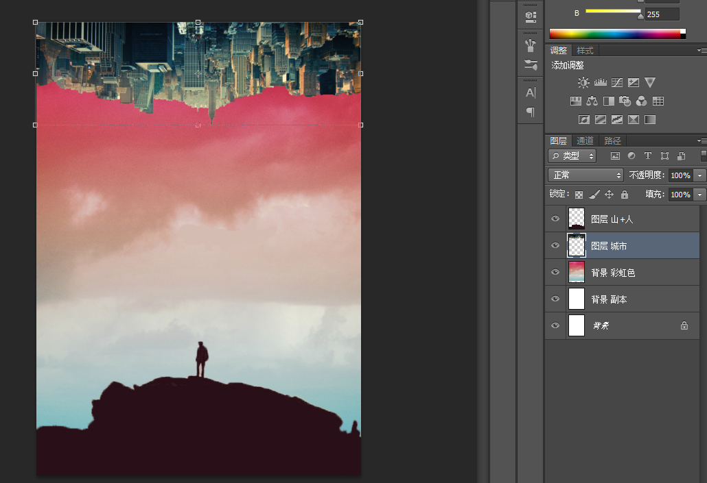 4.复制背景“彩虹色”,直接将其拖到文档“反转城市”。将图层“彩虹色”拖动到图层“山+人”的下方。