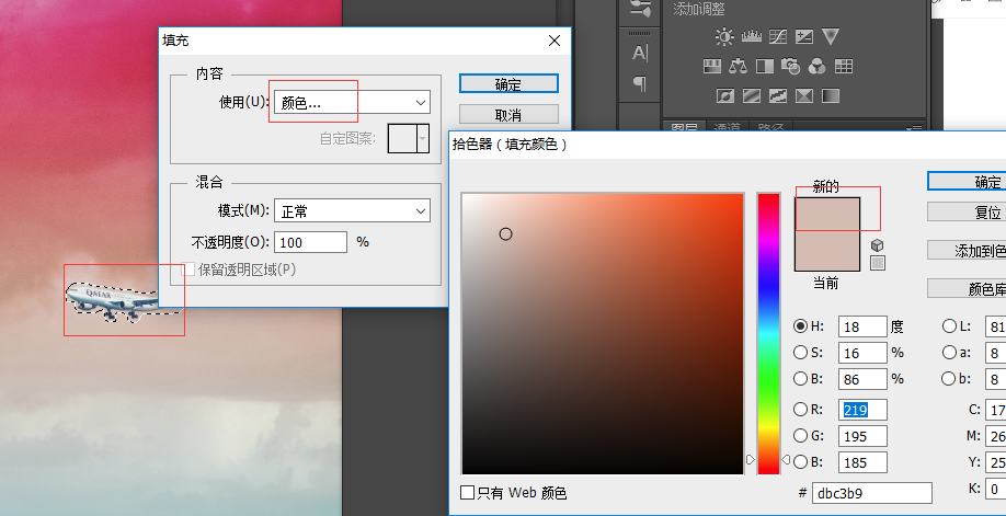 2.鼠标放在选区上,右击鼠标选填充,填充一个飞机附近相近的颜色。