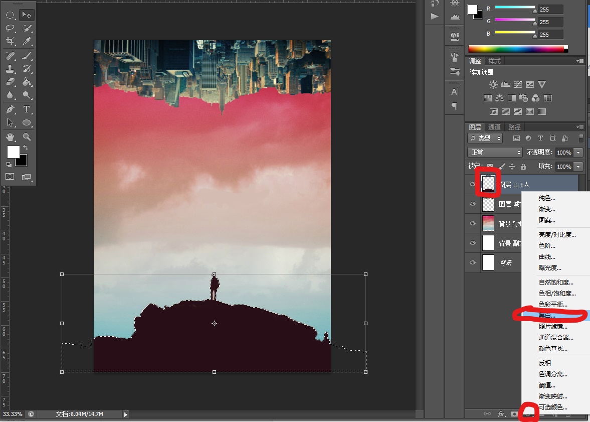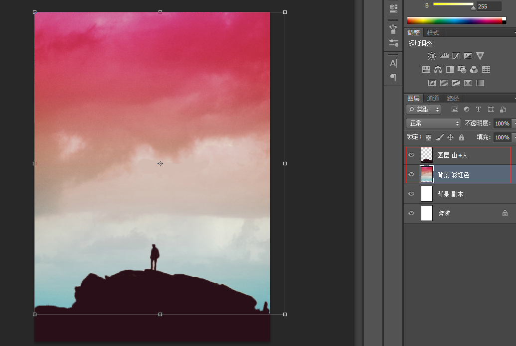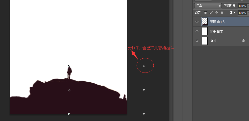 4.运用“ctrl+T”,将图层“山+人”移动变换到下方。