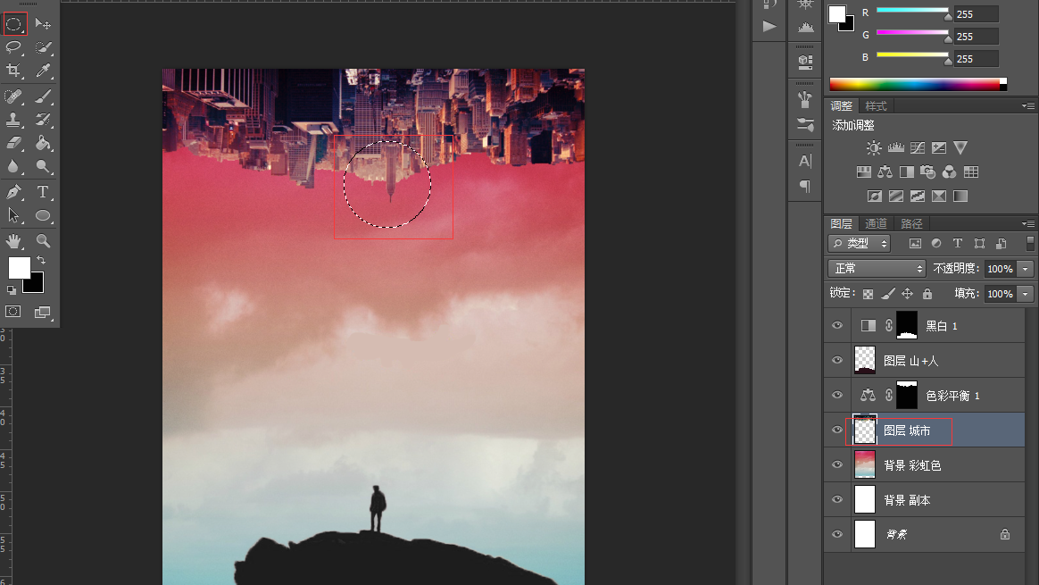 第五步:在城市图层上选择合适的位置后用椭圆选框工具画圆,CTRL+J复制一层,并进行垂直、水平翻转。