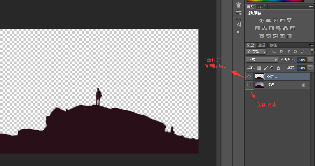 2.“ctrl+J”,复制图层1(山+人),关掉背景图层眼睛。