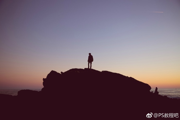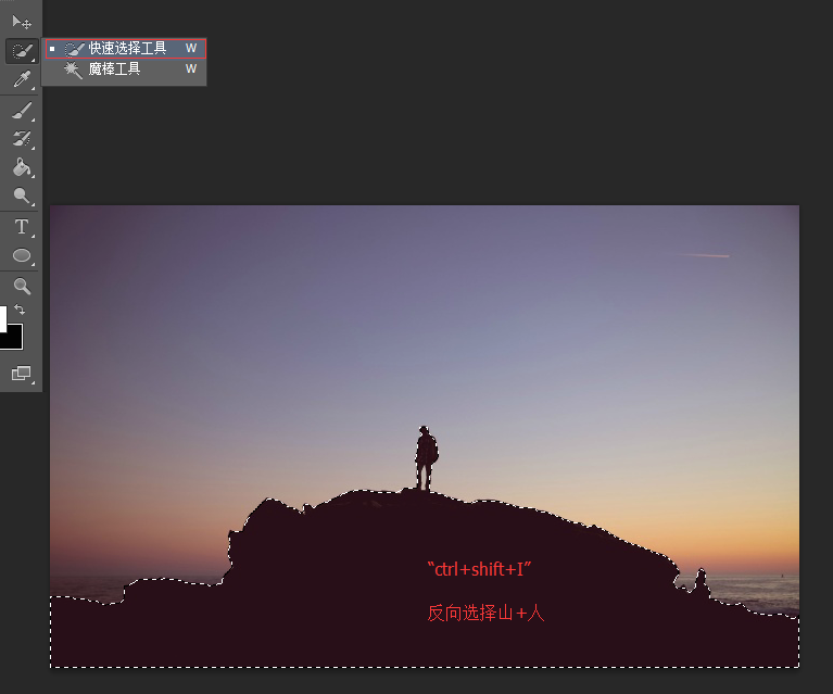 1.快速选择工具→“ctrl+shift+I”,反向选择“山+人”。