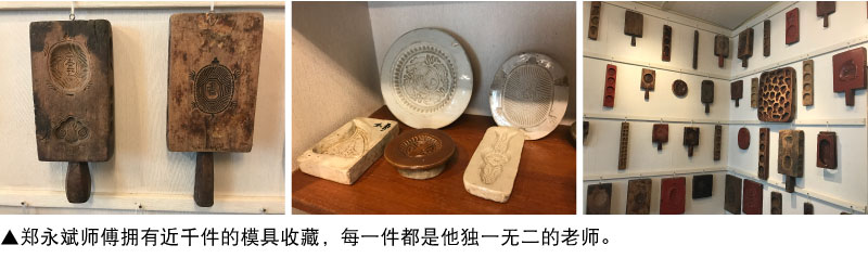 郑师傅不藏私地带我们去拜访他的“老师们”。原来他收藏老模具多年,数量、种类之多,令人惊叹!有的瓷制粿模甚至可追溯自明代,件件都是资深的老师傅呢!郑师傅说,不要看这些模具陈旧、纹路已浅,其实都是相当精彩的作品,雕工各异奇趣,图案的布局也不大相同。每件模具都经过他慧眼独具的观察,参透前辈们的独到功夫,再吸收为自己雕刻时的养份。不仅如此,郑师傅甚至能透过粿糕纹饰的风格,辨识这块模具早期是为台湾闽南人或客家人所用,对其背后蕴含的文化了然于心。