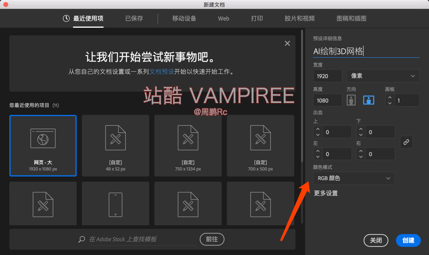接着新建一个1920*1080的画布。注意颜色模式RGB。