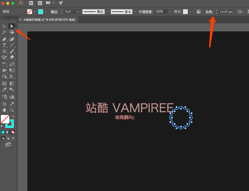 然后用直接选择工具选中该图形,可以上面可以输圆角,输入边角为15PX,确定后显示为14.57,正常 因为最大就是14 .57,输入15只是一个大概。