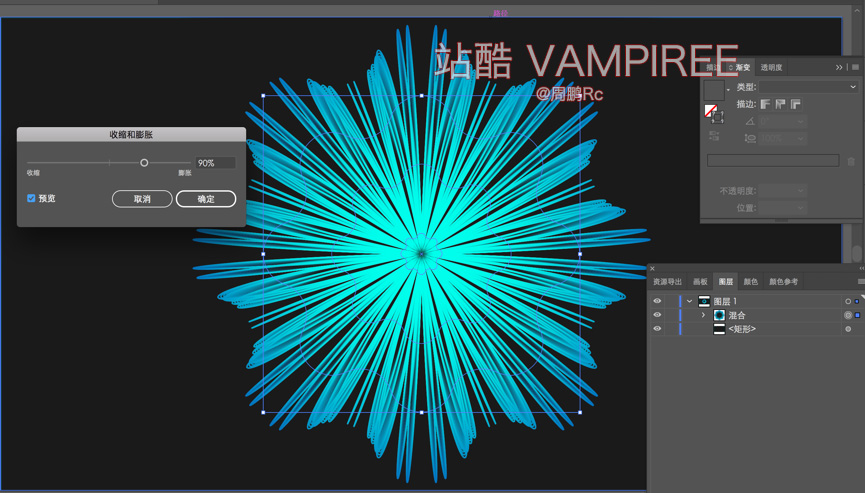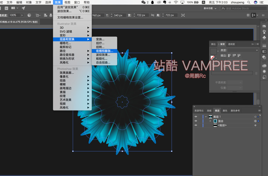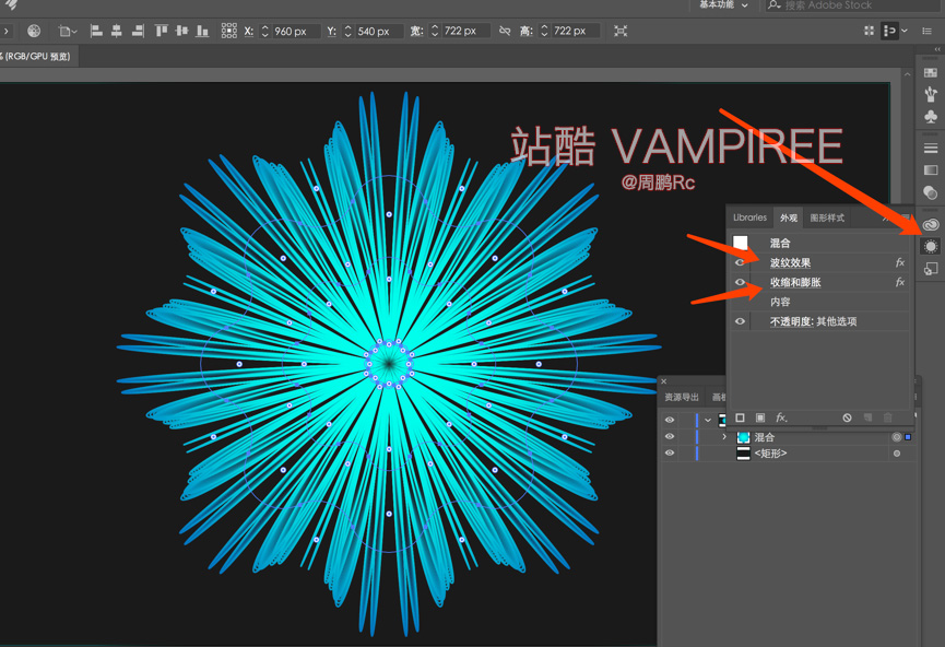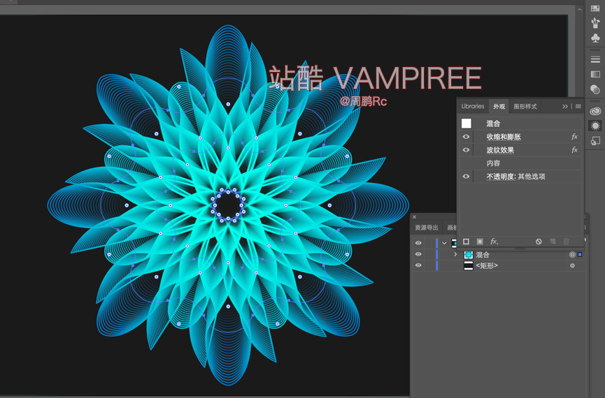 把收缩和膨胀这个效果拖到效果波纹上面就好 得到如下效果 完美