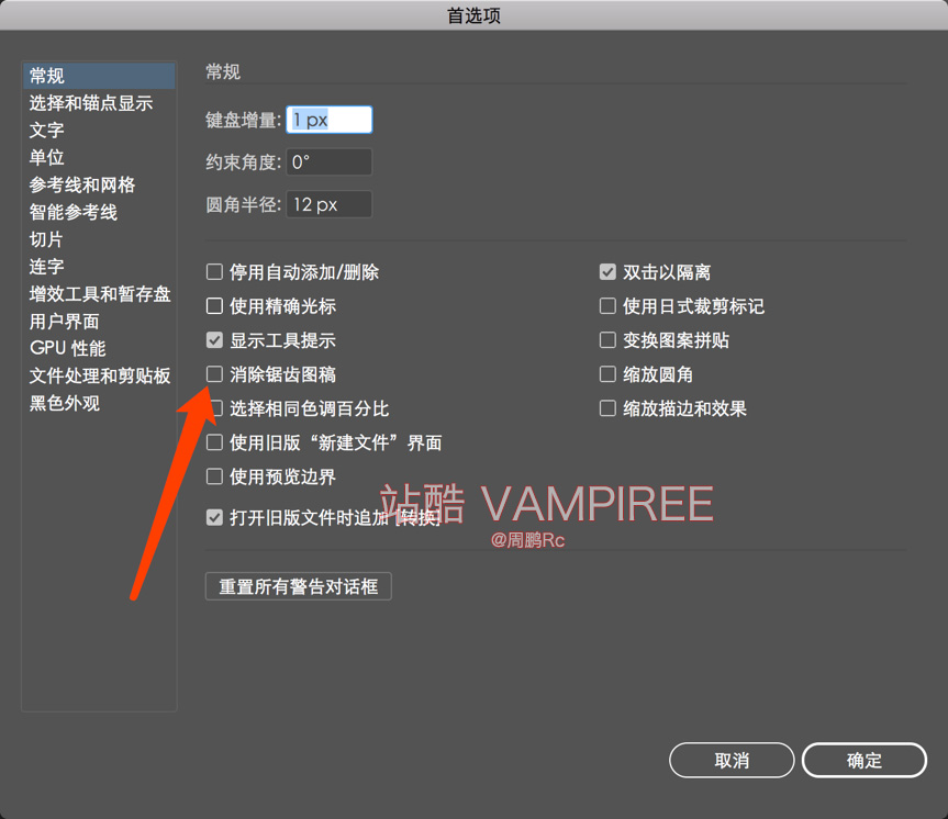 首先打开AI 然后调出首选项 确定消除锯齿图稿没有修改(注意是不要勾选)然后点击确定即可。