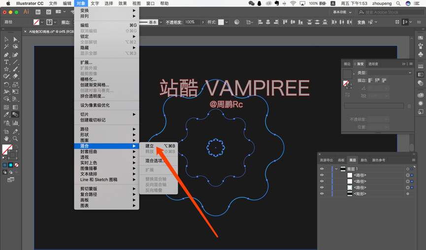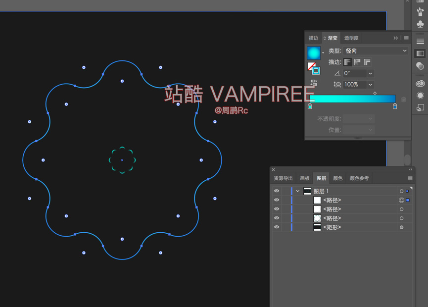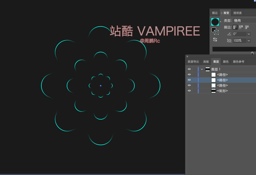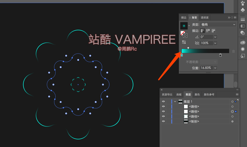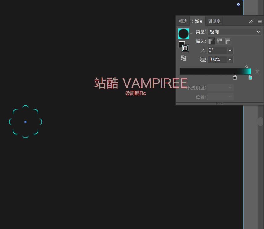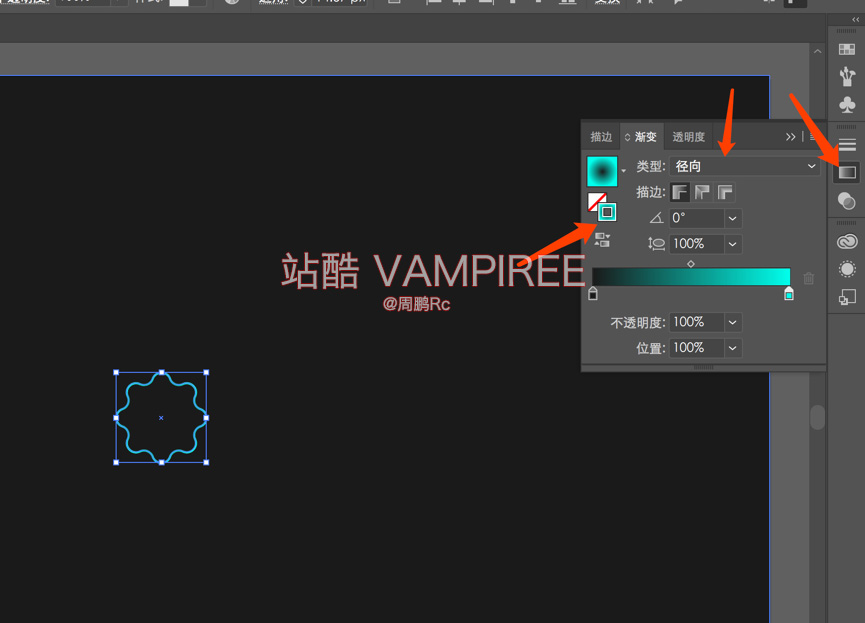 然后选中图形,点击左侧渐变,注意是描边放在最上面,要没就是渐变填充了,然后为径向渐变。