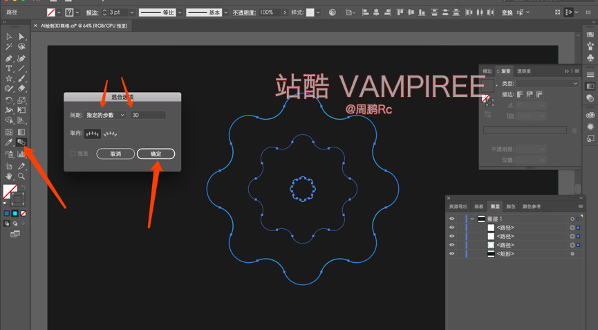 接下来选中三个环,然后点击左侧混合工具 设定指定步数为25,然后点击确定。