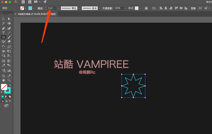 然后选中星形,开启描边关闭填充,描边宽度为3PT,颜色为00FFEC