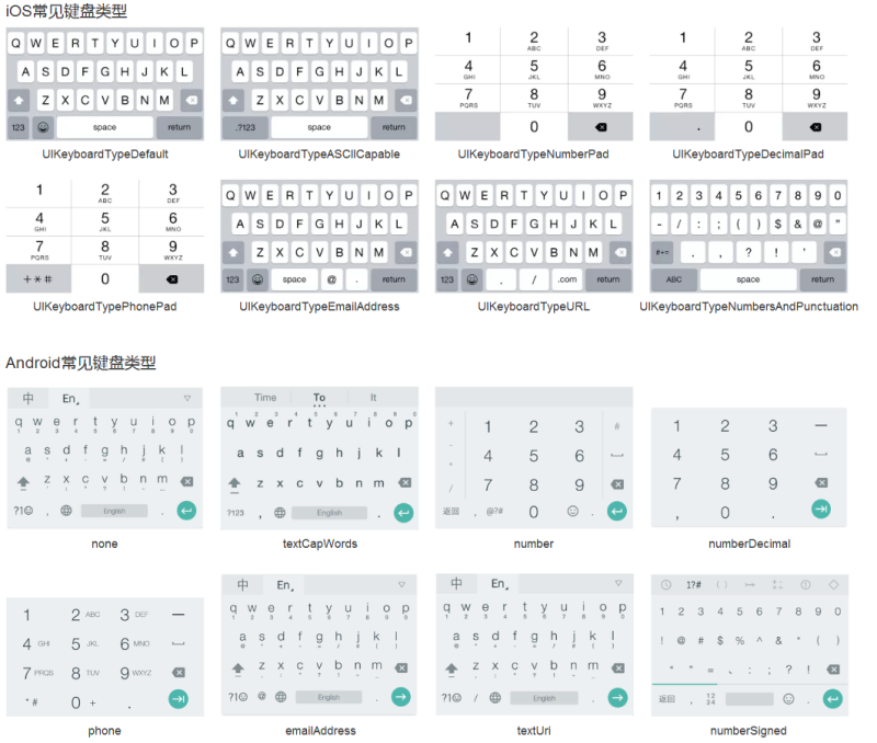 iOS、Android提供多种键盘类型布局,常用的键盘类型布局有:(参考http://www.uisdc.com/soft-keyboard-design-element#)