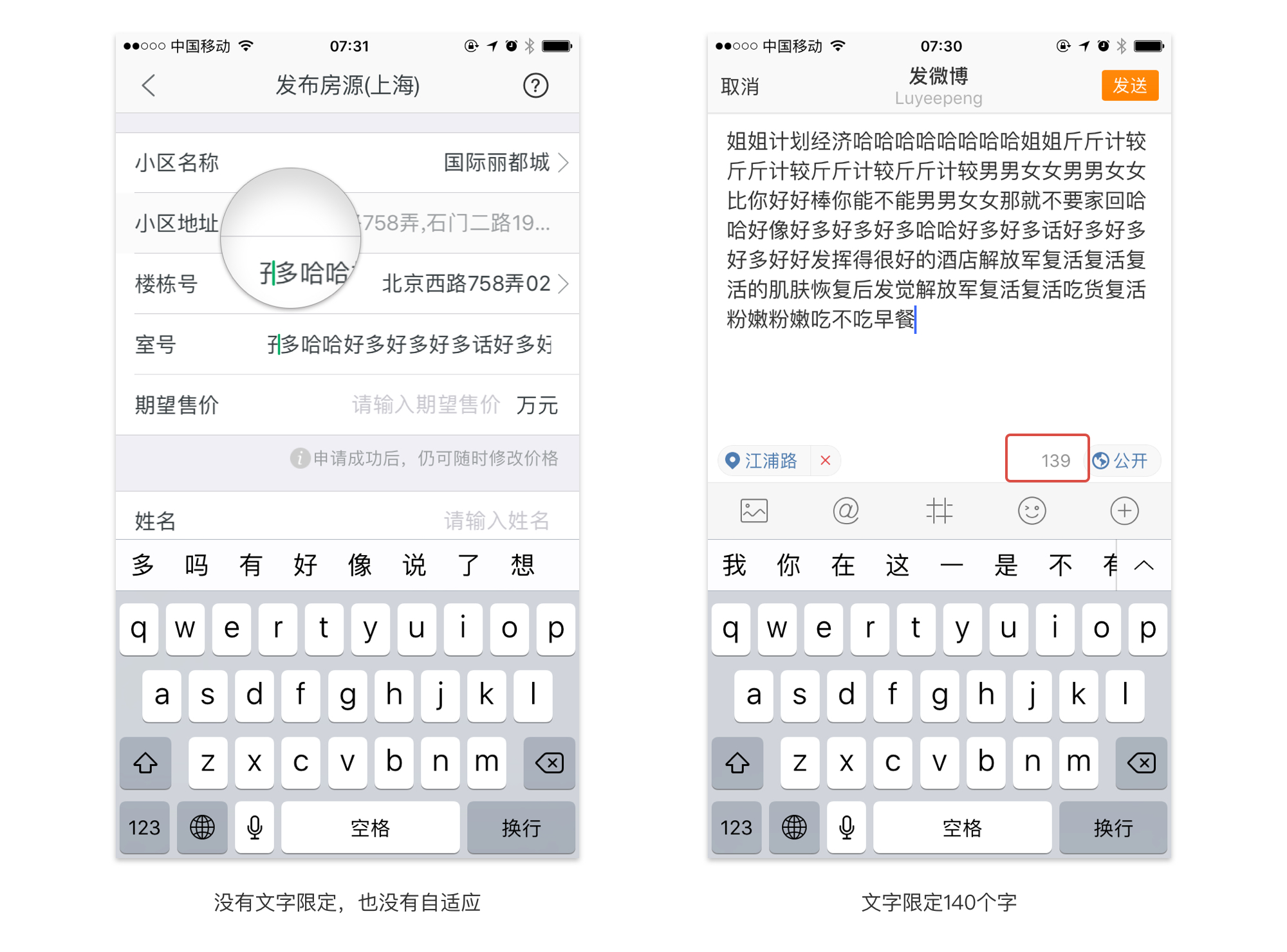 如果在设计的时候不考虑这些,开发很容易忽略这些问题,然后你就可以看到一大堆文字盖在标签上了。最好的方式就是把输入的文字全部展示出来,如果你为了节约空间,也可以一行展示,多余的用”…"表示。我们还可以采用新页面来专门输入,这样就解决了这个问题,也不怕文字过多了。