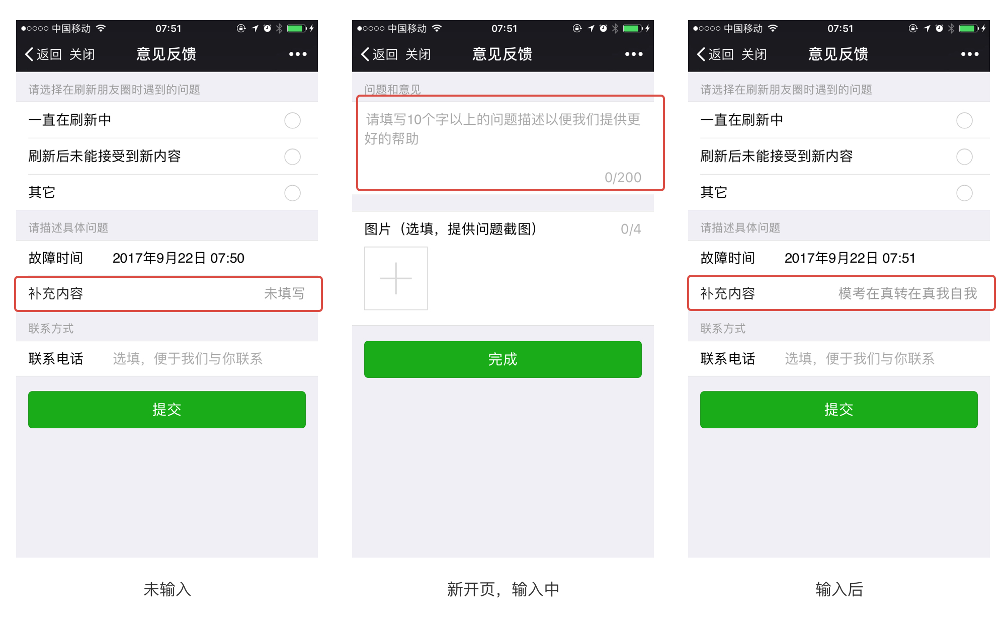 我们在录入表单的时候,通常会有默认提示文字,帮助我们更好的理解需要录入的内容。一旦表单获取点击焦点,提示文字就消失了,用户不再能看见它。所以这样其实是有个缺陷的,这会让用户产生短期记忆的压力而增加错误的机率。在移动端这种缺陷是被大多数忽略的,因为多数情况下默认文字是非常简单易理解的,如果出现非常复杂的提示,则我们应该增加说明文字进行说明。