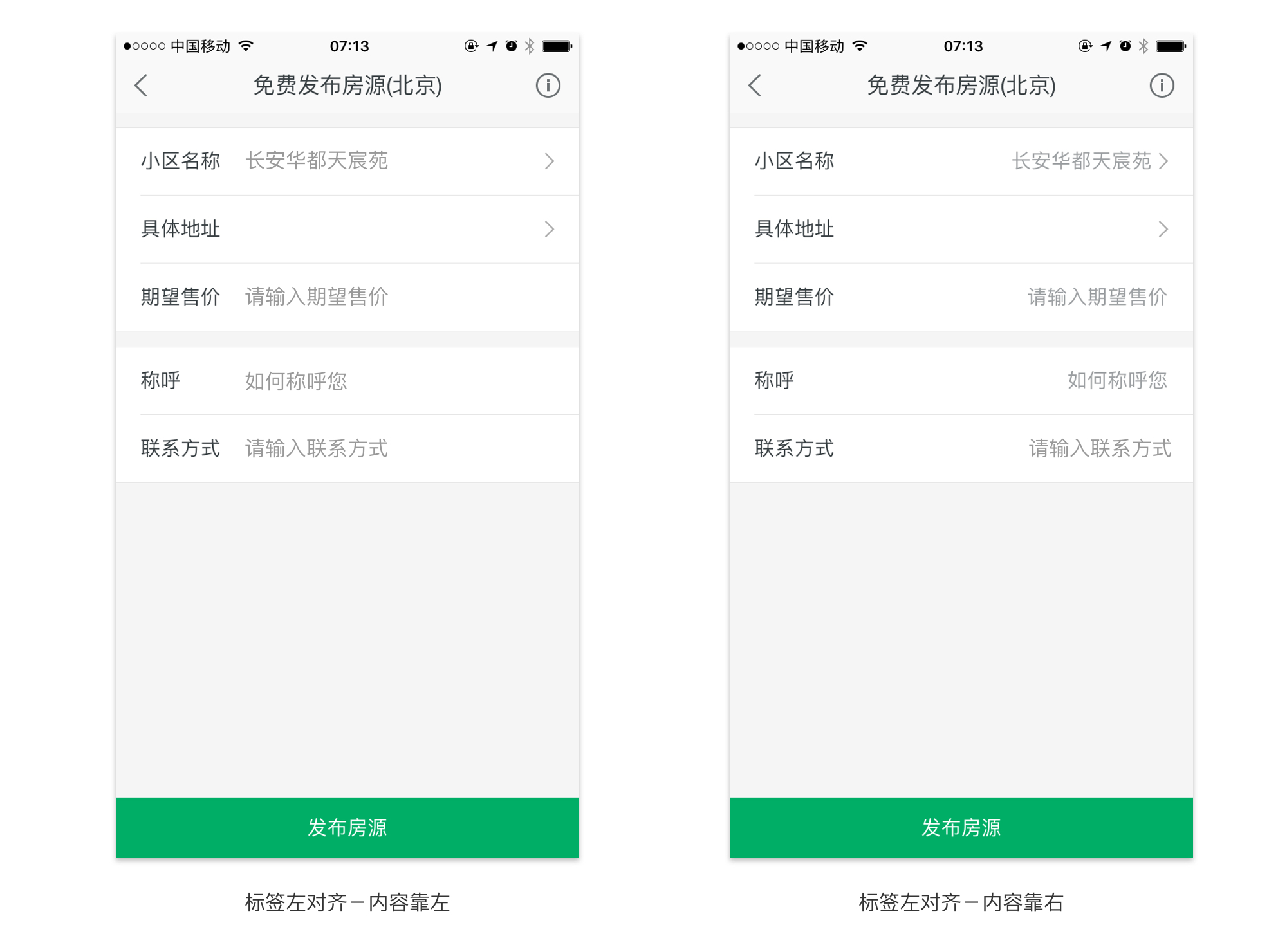 然而,移动端中的表单,我们经常看见的是标签左对齐,其原因也以想象:节约空间、统一布局。其实我们在考虑标签的对齐方式的时候,也需要考虑输入内容的对齐方式。常见的内容对齐方式有:左对齐、右对齐。