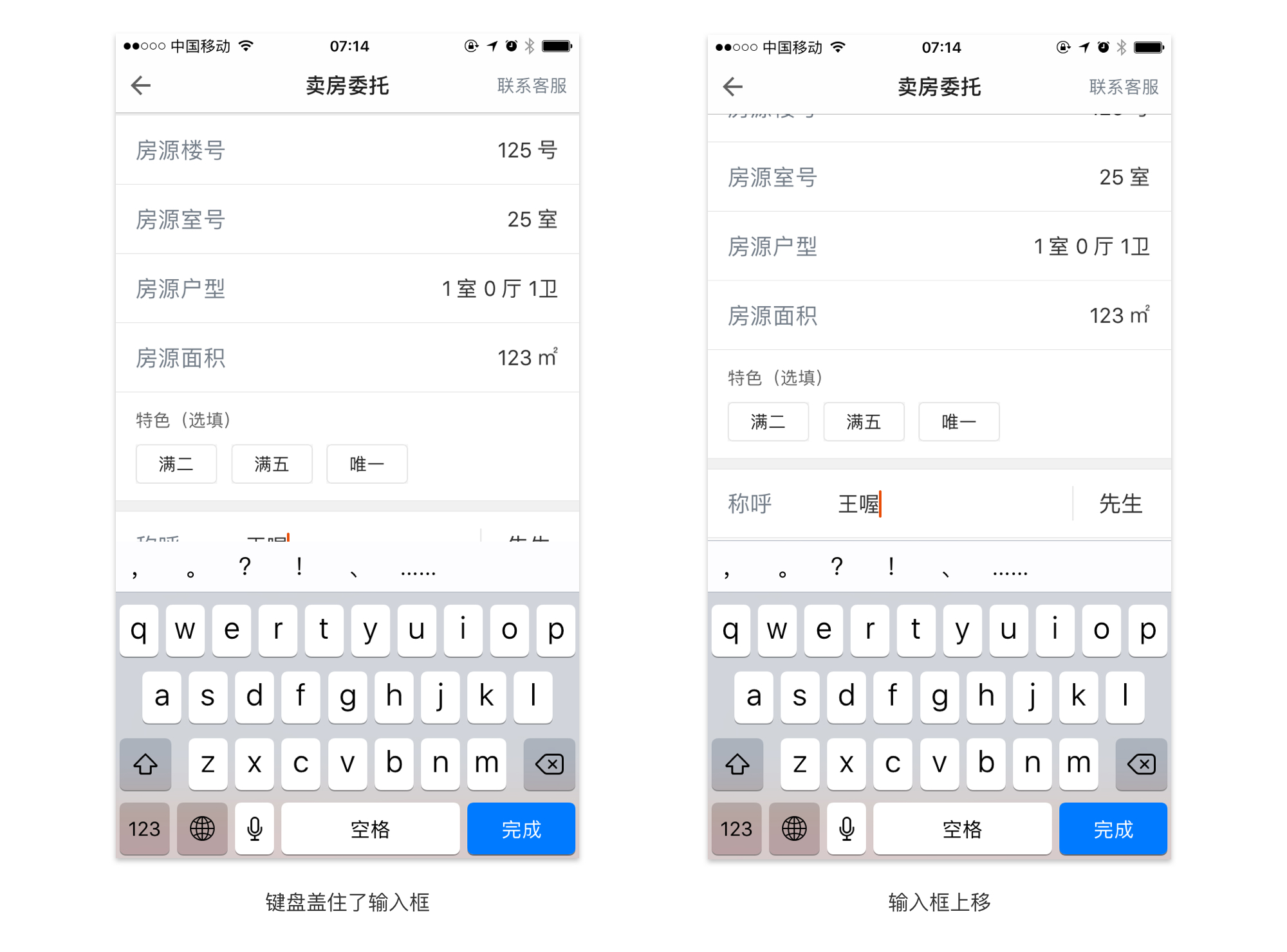键盘选择好后,也应该考虑键盘弹出时,页面的展示方式。有的app在这里没有考虑太多,弹出的键盘直接把输入文本框挡住,造成用户体验非常差。所以,当你的输入框在键盘的下面的时候,应该将输入框推到键盘上面,保证用户输入的可见性。