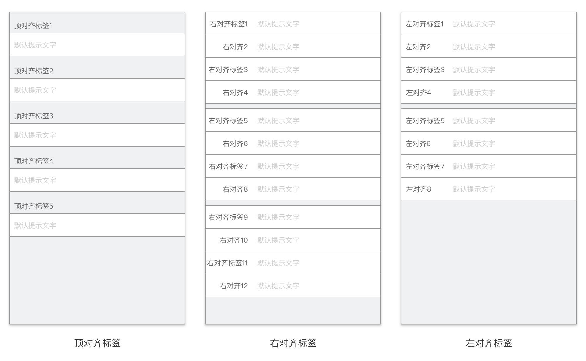 但是,在表单内容过多的时候,文字标签更常用。要知道,文字的识别度是远高于图标的识别的。常见的标签有顶对齐、右对齐、左对齐。
