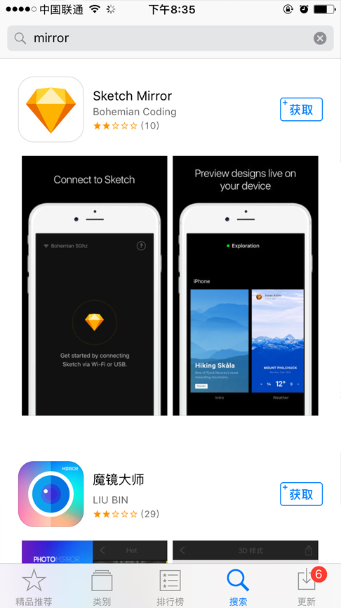 3、打开Sketch点击mirror就能搜到移动端(移动端网络和PC端的网络需在同一网络内才可)