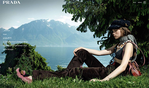 PRADA官网也比较特色,鼠标悬停到左边菜单时,依此展现相应的大图,很大气简洁。悬停到中间的“prada荣宅”时,展示的是自动播放的大屏视频,一静一动也有对比突出的效果。