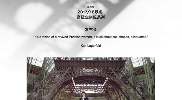 香奈儿的官网简洁优雅,其中“2017/18秋冬高级定制服系列”页面(“高级定制服”版块)里的视频和图片虽然不像常规排版那样对齐的很规整,但是错落有致,给人时尚之感。