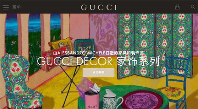 古驰官网整体设计很棒,土豪金的整体配色和它的品牌风格相统一,精致奢华。
