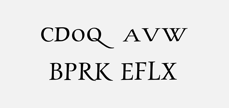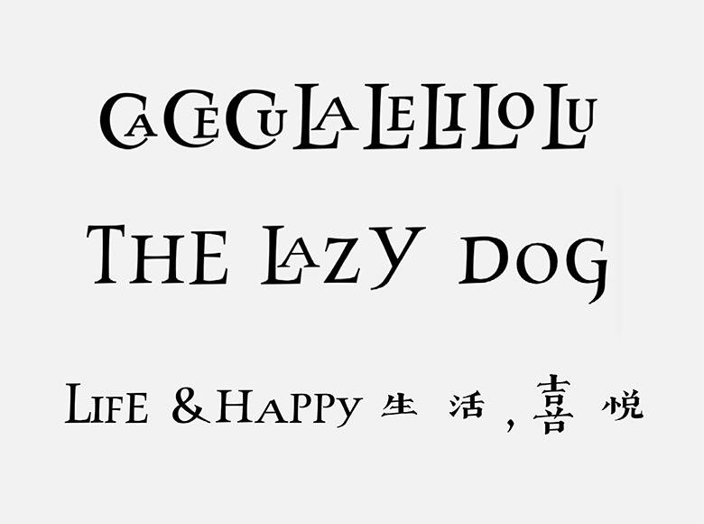 根据汉仪古趣中文设计的大小错落之感,在西文中也尽量匹配相应的特征,例如O、C、 D 等字母设计比较小和矮, B、E、F、P 等字母设计则比较瘦高。