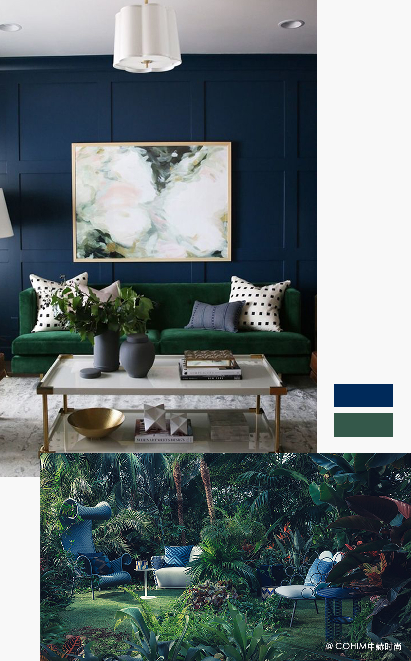 蓝色,是天空的颜色,绿色,是丛林的颜色,自然的色调组合释放着自然的魅力。炎热的夏日里,蓝色与绿色的组合为室内带来清爽的森林之风,尤其是深丛林绿。此外翡翠色和蓝色也是相得益彰的搭配组合。