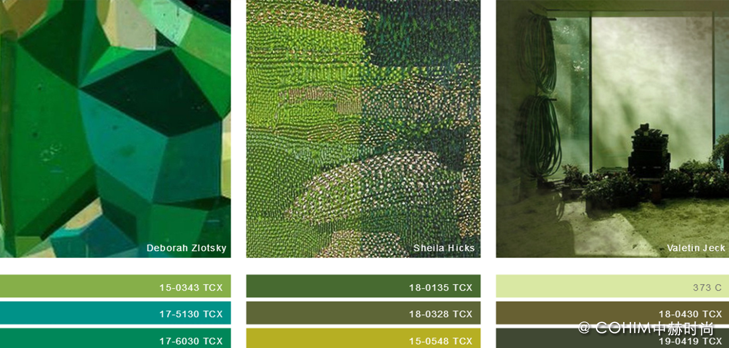 18年春夏中国色彩趋势(绿):军绿色、清新翡翠色、大理石绿、硫磺绿、海带绿、深丛林绿、气泡绿、台球绿。