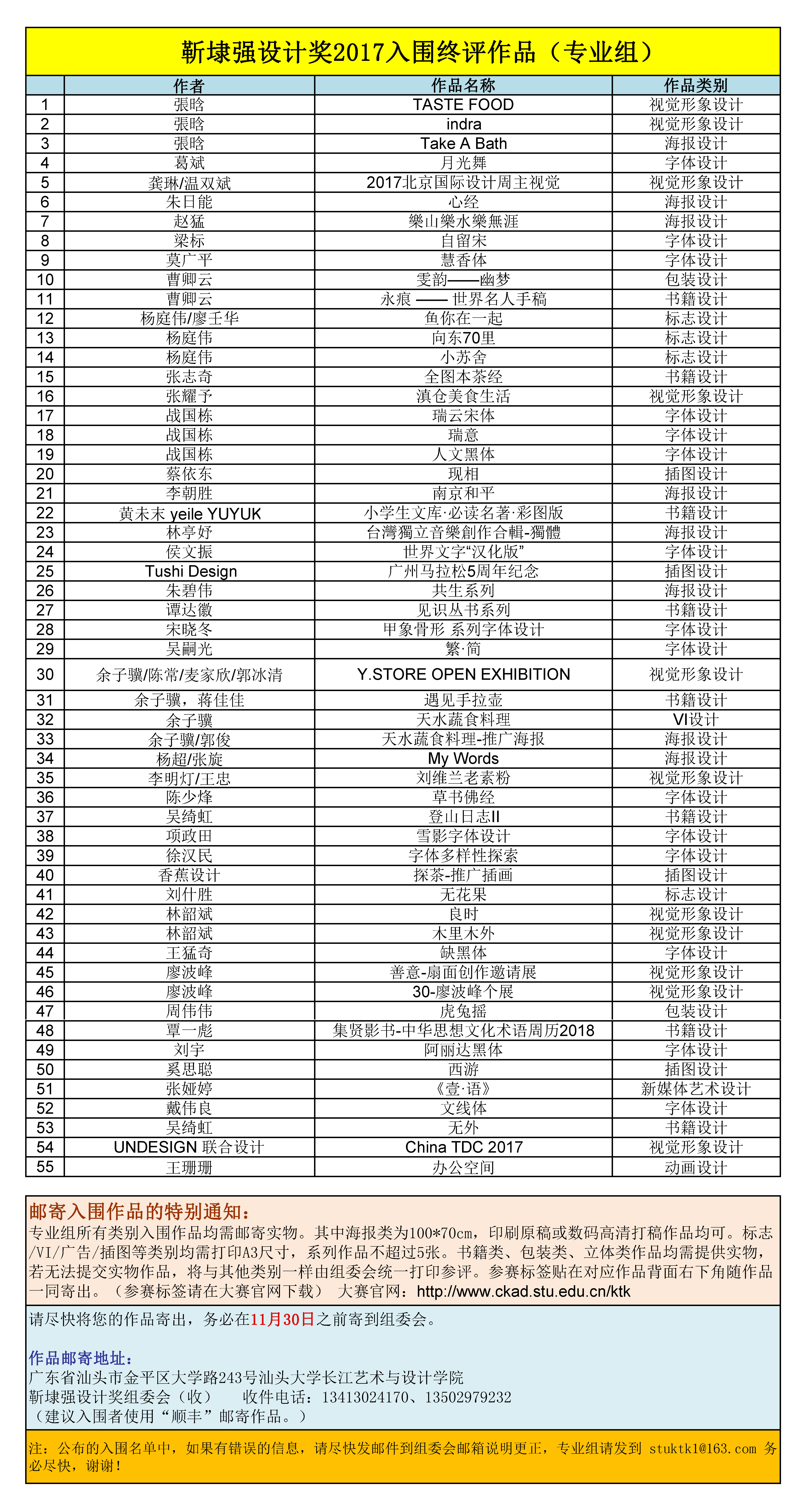 邮寄入围作品的特别通知: